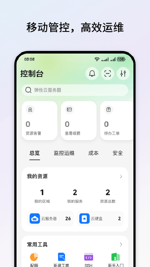 1、支持弹性云服务器、云硬盘等资源移动管理,API调试、SSH等操作一键完成。