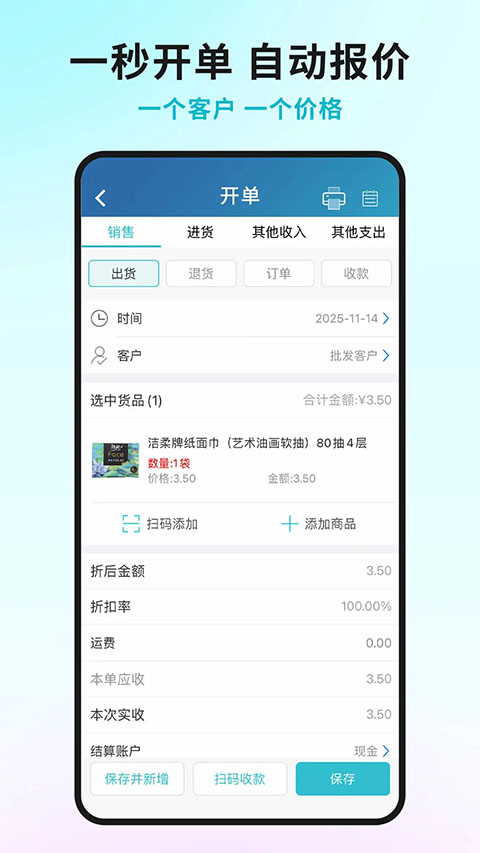 2、内置符合小规模纳税人需求的票据管理模块,可快速生成合规的销售出货单。