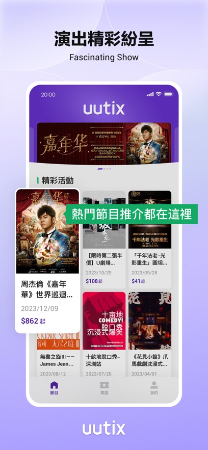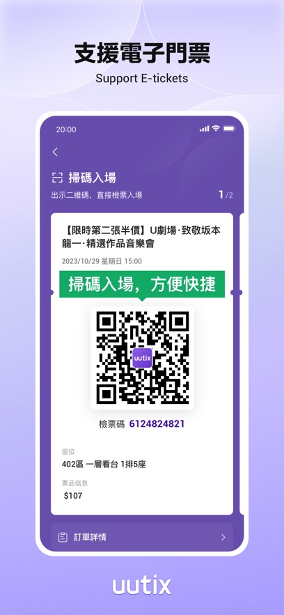 uutix app是一款面向港澳用户的文娱票务软件,主打演唱会、戏剧、展览等各类演出购票服务。用户可以随时在线查询演出信息、挑选心仪场次,还能通过清晰的座位图自主选座,一键完成支付,全程操作简单方便。uutix会实时更新丰富的演出资讯,购票后支持电子票据,不用再担心实体票丢失或不便携带。uutix把不同场馆、不同主办方的活动信息统一整合在一起,不用来回切换多个平台就能找到想看的演出。除了基础购票,还提供剧目介绍、主创团队、剧评等内容,帮大家更全面地了解演出,选到真正喜欢的活动。