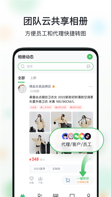 2、团队成员共用共享相册,员工与代理可快捷转图,提升协作推广效率。