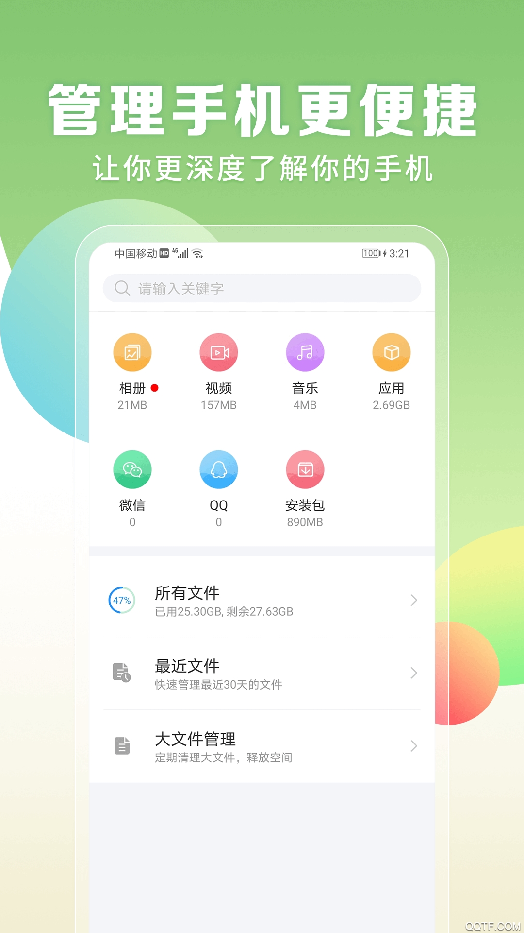 2、扫描清理手机垃圾文件与大文件,释放存储空间,让设备运行更流畅。