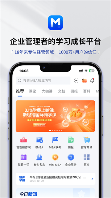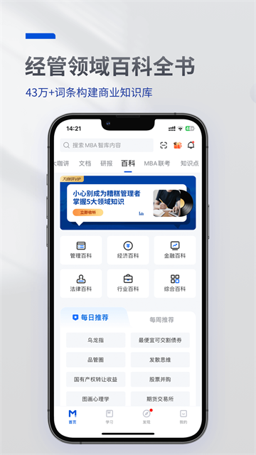 MBA智库app是为经济管理领域人群打造的专业知识平台,这里有管理者、创业者、专家学者等群体共同交流与分享经验。2026最新版拥有超四十万条专业词条,包含管理经济金融法律行业等多个板块,内容详尽且表述清晰,零基础也能理解专业术语。每日推送财经热点与新词解读,帮助及时掌握行业动态。平台提供千万级专业文档与深度行业研报,搭配千余门在线课程与大咖讲座,满足职场提升管理学习MBA备考等多种需求。词条支持收藏分享与云端同步,离线状态也能正常阅读。