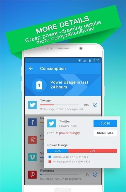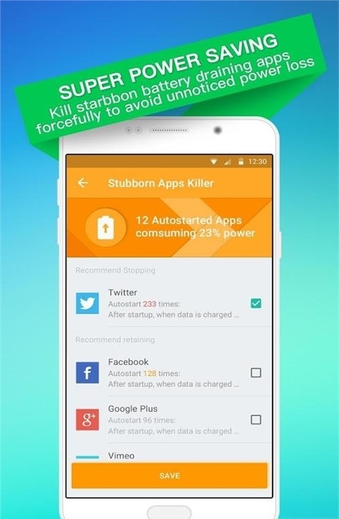 1、一键强制关闭耗电顽固应用,避免电量在不经意间流失,关键时刻管用。