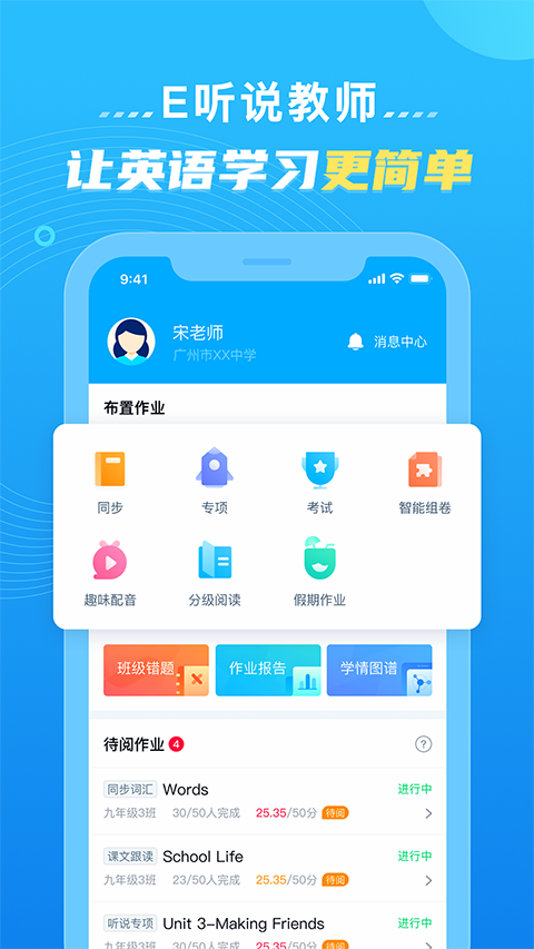 E听说教师是一款专为老师打造的英语教学管理软件,紧扣中高考标准,不管是布置日常作业、阶段测试,还是专项训练、综合模拟,都能一站式满足,帮老师智能批改口语和作文作业,还能生成详细学情报告,让教学更有针对性,支持同时管理多个班级,操作简单易懂,遇到问题还有客服帮忙解决,大大减轻老师的教学负担,让教学效率直线提升,是英语老师日常教学的得力助手,英语学习十分的流畅,这里的英语学习高效便捷,尽享不错的学习体验。