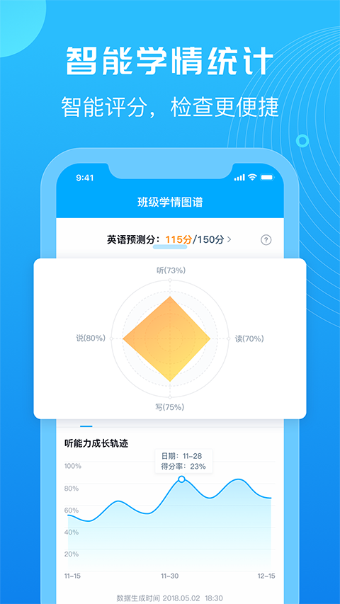 E听说教师作业资源超丰富,从日常练习到模拟考试都能满足,还能智能批改口语和作文,学情分析特别精准,清楚知道班级整体和单个学生的薄弱点,方便针对性教学,多班级管理功能实用,还能自定义创建班级,推荐给各位英语老师,绝对能让教学效率翻倍,而且平台的学习资源都是非常丰富,让大家随时都可以尽享最佳的学习体验。
