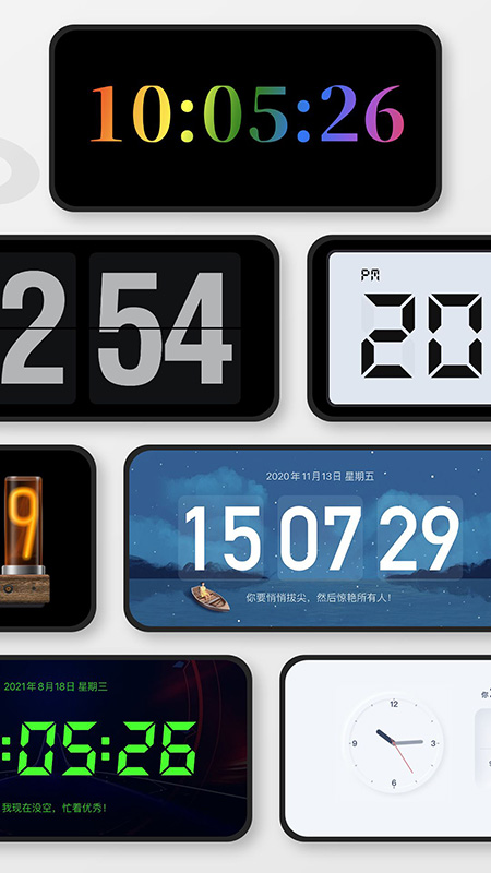 3、简约表盘、极简数字、动态翻页等多种风格任选,主题样式超多样,任意选。