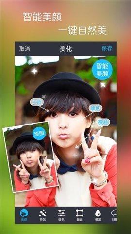 4、人像特效实时生效,白嫩、清新美白、洛丽塔等风格任选,自拍瞬间更美丽动人。